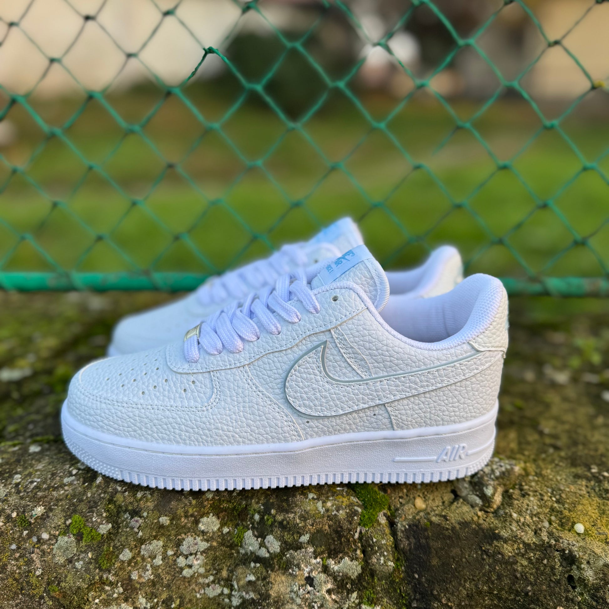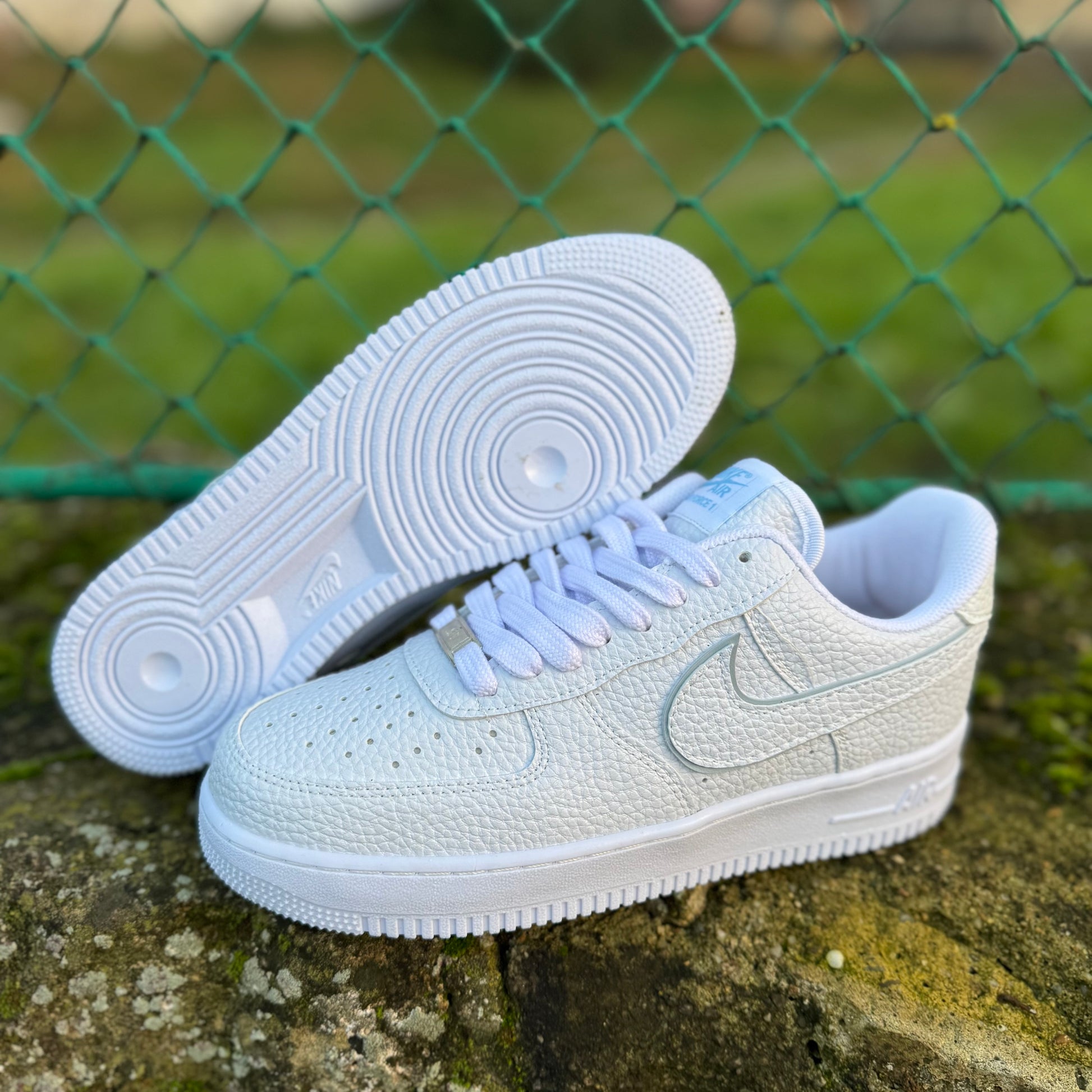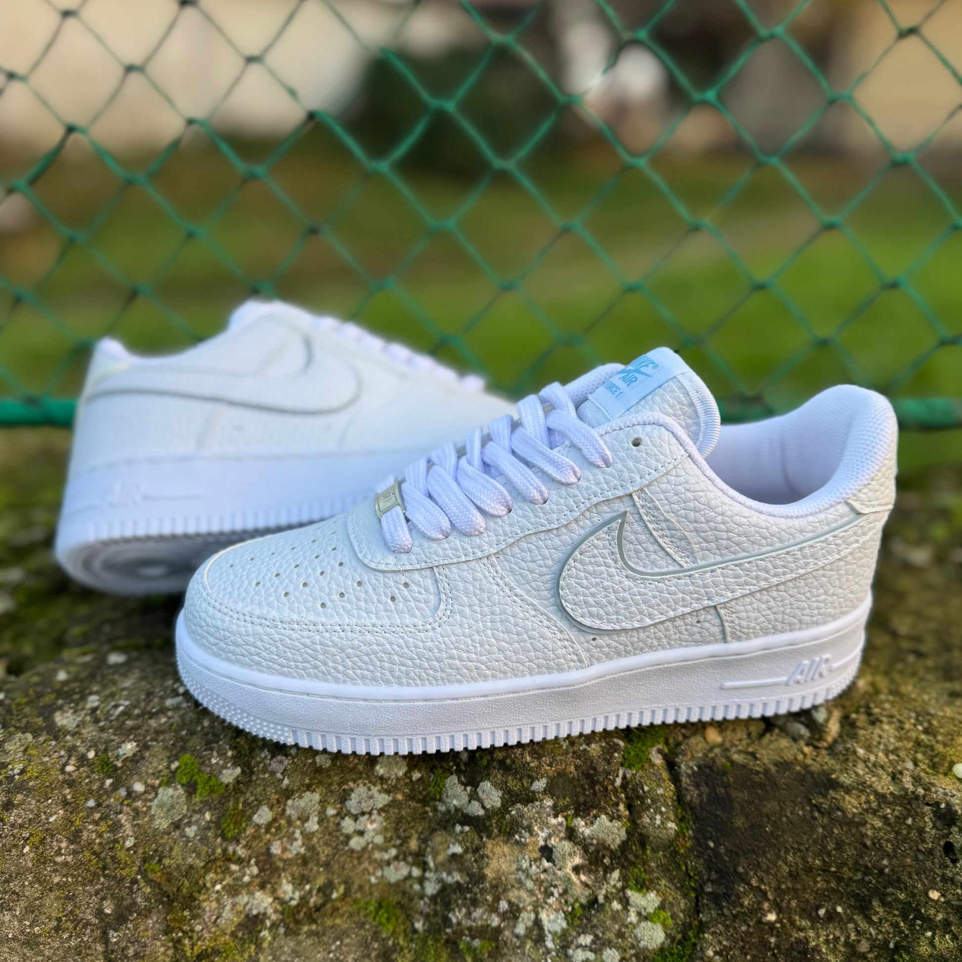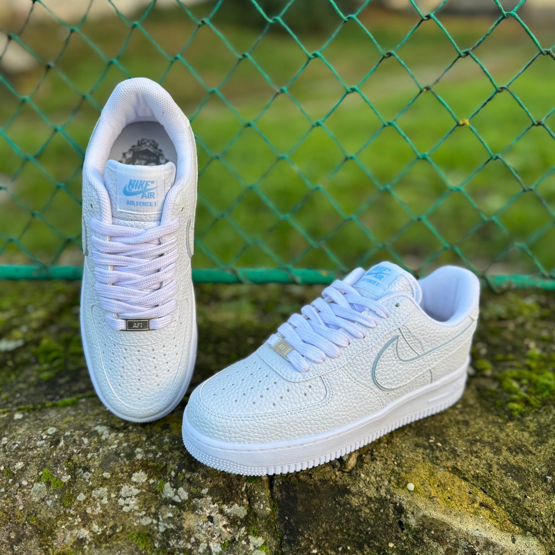 ✨ Accesorii: Etichetă metalică “AF-1 82” pe șireturi și swoosh argintiu cu contur subtil